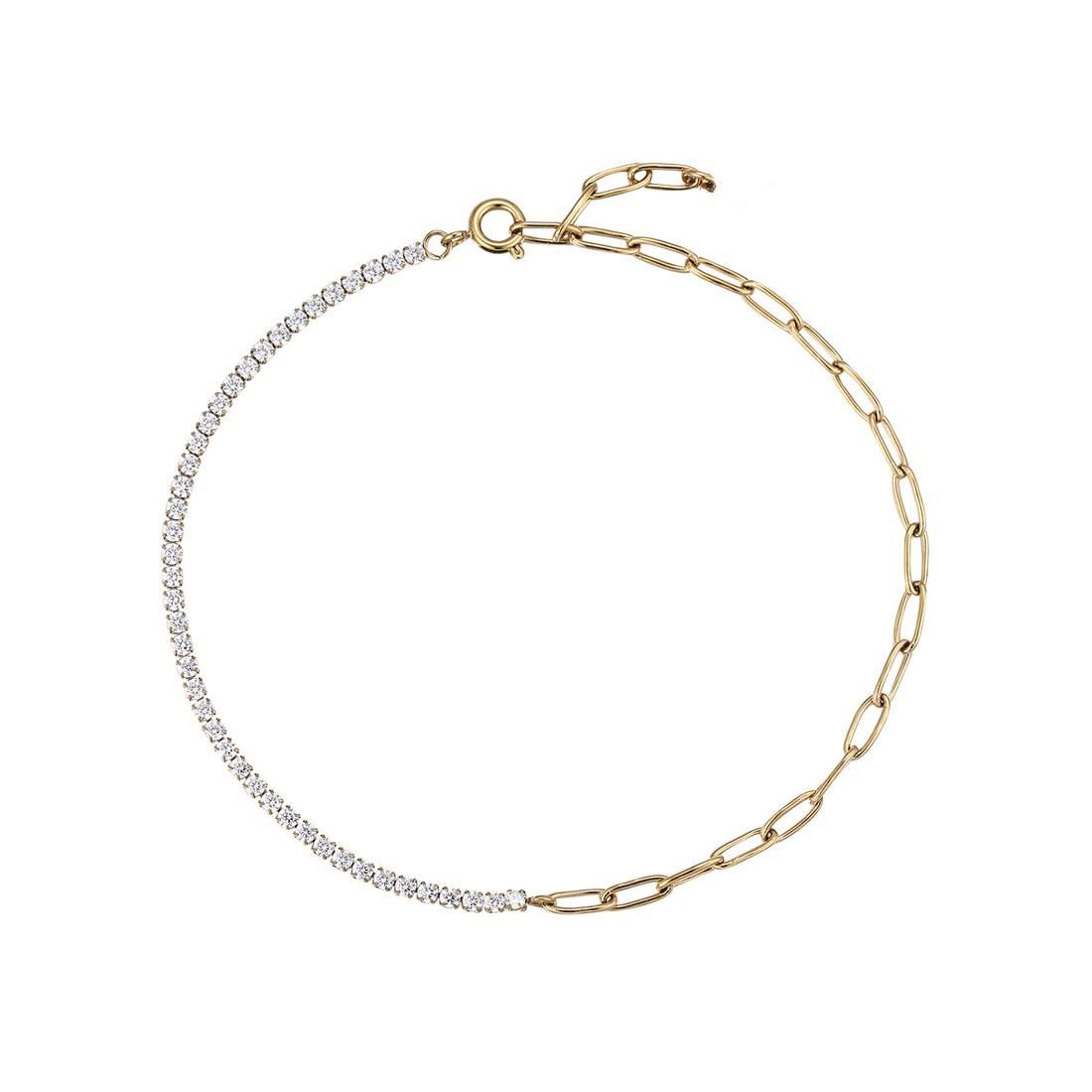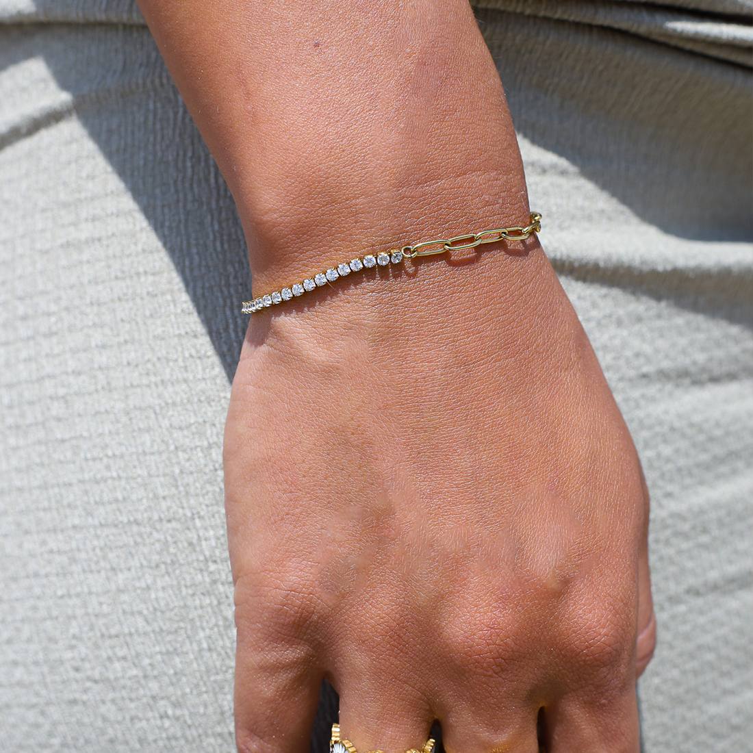 Bracelet Alexa : Ce bracelet incarne l'élégance moderne avec son design unique, alliant finesse et brillance. Une moitié est ornée de délicates pierres de zircon, ajoutant une touche de scintillement subtil, tandis que l'autre moitié présente une chaîne en maillons dorés, créant un contraste harmonieux et tendance.