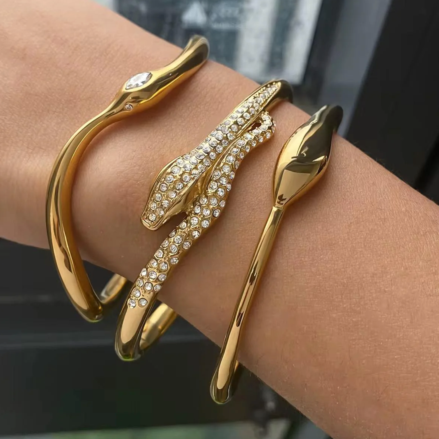 Osez le pouvoir et le mystère avec le set Golden Venom – trois manchettes serpentines au design saisissant. Chaque pièce incarne une facette de la féminité : éclat, élégance et force.