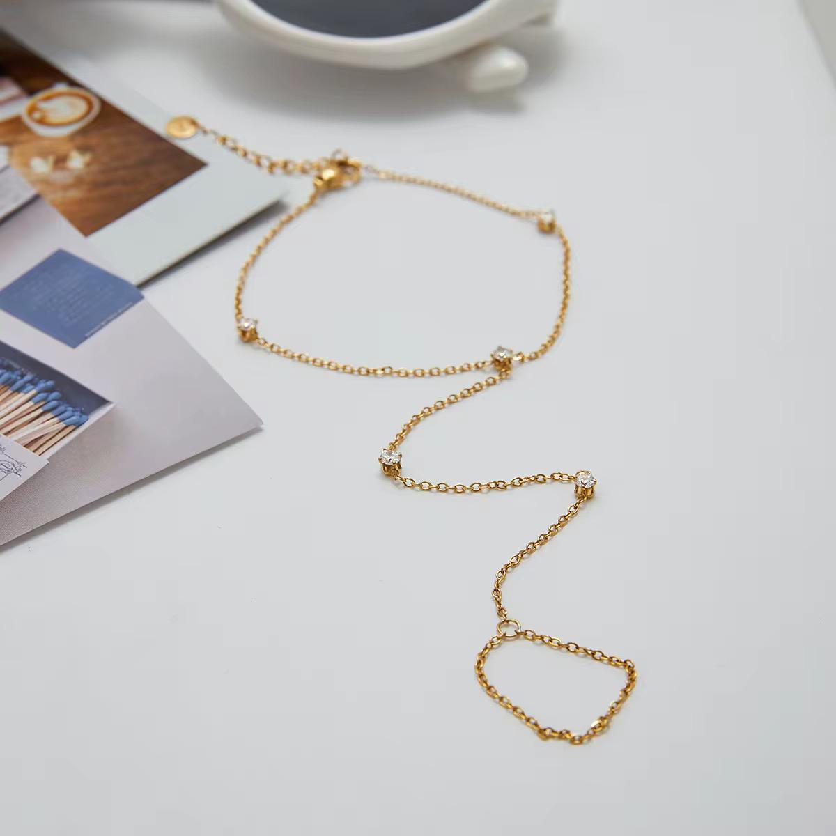 Une pièce délicate et envoûtante qui habille la main avec finesse. Composée d’une chaîne dorée ultra fine et de pierres scintillantes, cette chaîne de main relie subtilement le poignet à l’anneau du doigt pour un effet bijou original et raffiné.