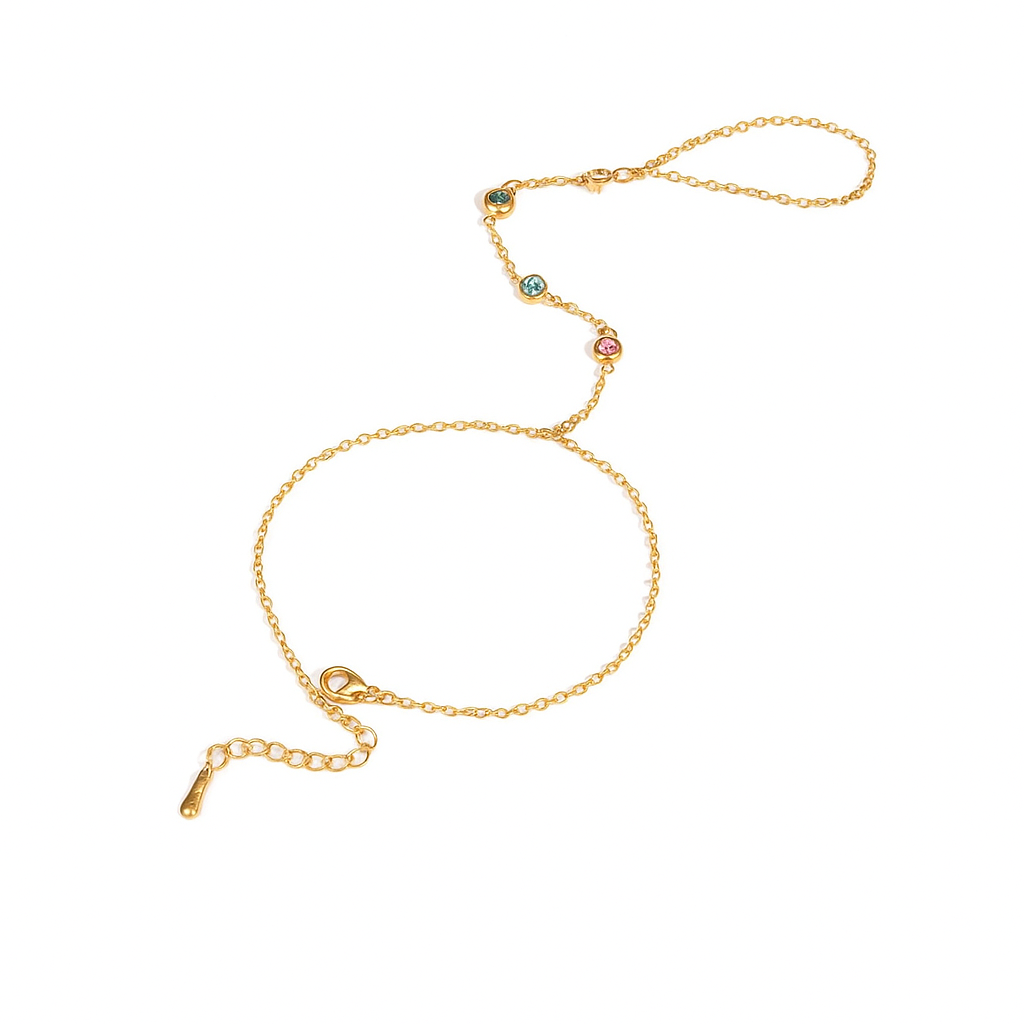La Chaîne de Main Iris illumine la peau avec ses délicates pierres colorées serties sur une fine chaîne dorée. Inspirée par la déesse de l’arc-en-ciel, elle symbolise la beauté, la féminité et la joie.
